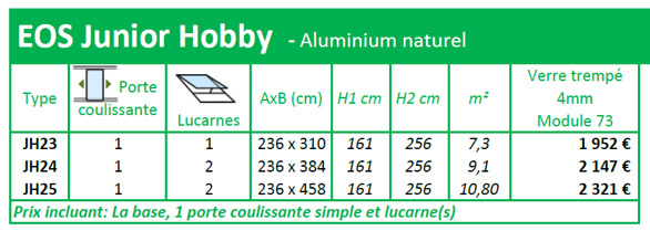 Aluminium laqué vert (ral 6009) ou noir (Ral 9005) Descentes de gouttières. Porte coulissante simple, lucarne(s) incluses Embase. Largeur vitrage 73 cm