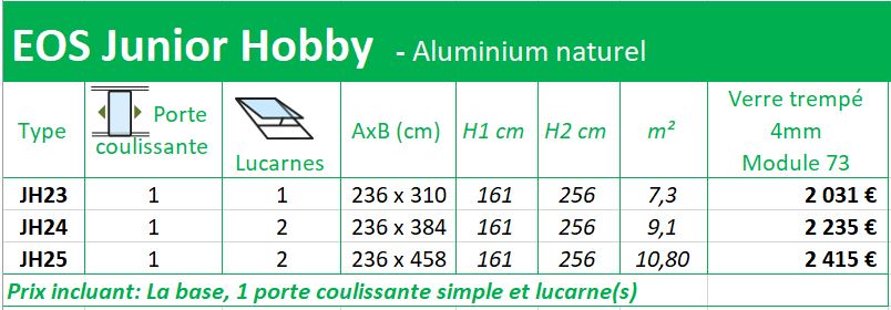 Aluminium laqué vert (ral 6009) ou noir (Ral 9005) Descentes de gouttières. Porte coulissante simple, lucarne(s), louvre inclus Embase. Largeur vitrage 73...