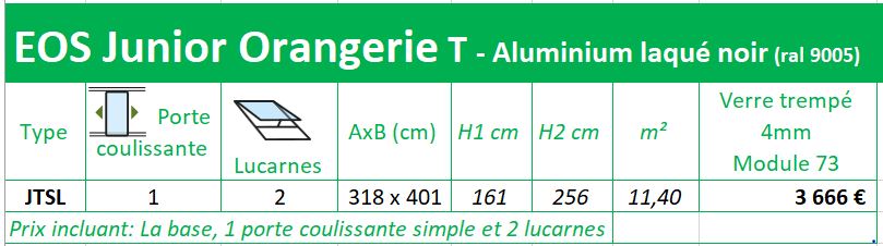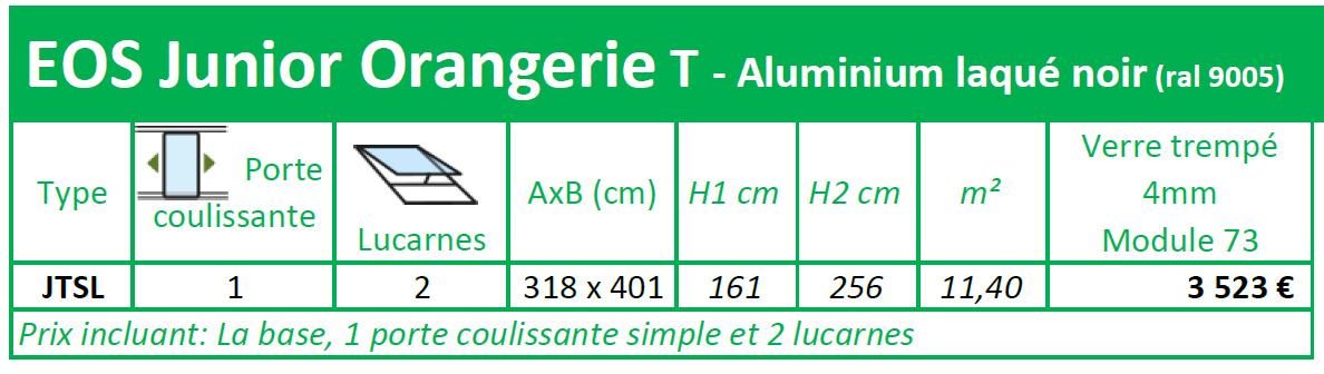 Aluminium laqué vert (ral 6009) ou noir (Ral 9005) Descentes de gouttières. Porte coulissante simple, lucarne(s) incluses Embase. Largeur vitrage 73 cm