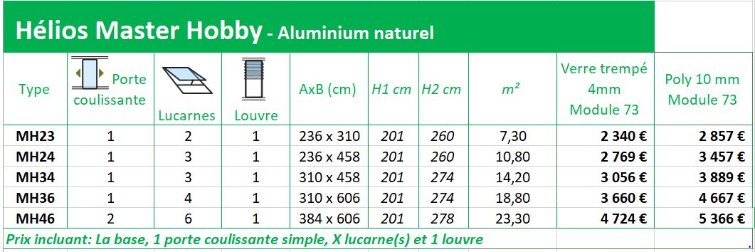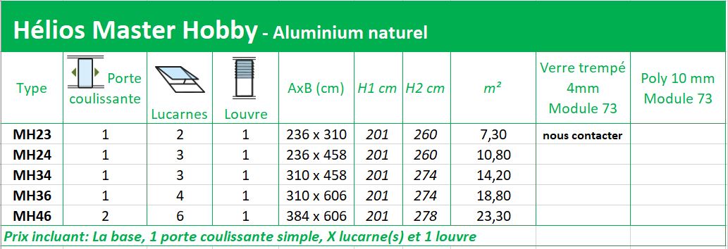 Aluminium laqué vert (ral 6009) ou noir (Ral 9005) Descentes de gouttières. Porte coulissante simple, lucarne(s), louvre inclus Embase. Largeur vitrage 73...