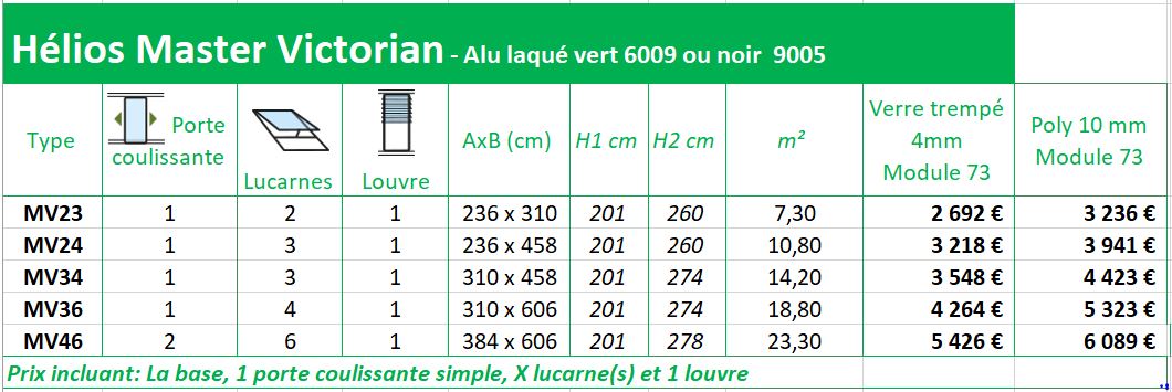 Aluminium laqué vert (ral 6009) ou noir (Ral 9005). Descentes de gouttières. Porte coulissante simple et un louvre inclus Embase. Largeur vitrage...