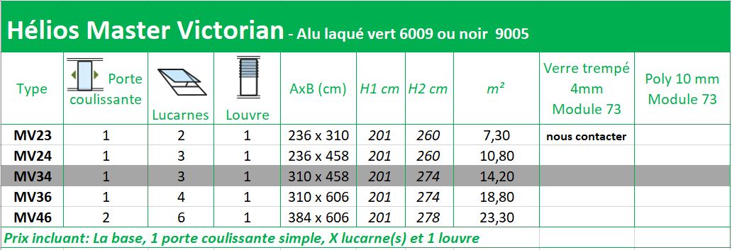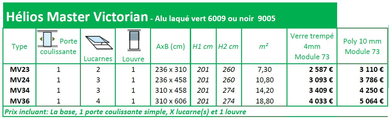 Aluminium laqué vert (ral 6009) ou noir (Ral 9005) Descentes de gouttières. Porte coulissante simple, lucarne(s) incluses Embase. Largeur vitrage 73 cm