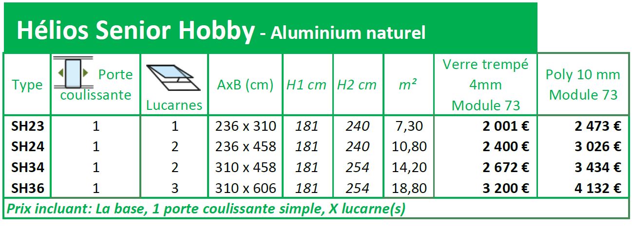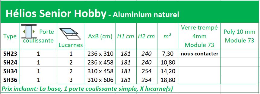 Aluminium laqué vert (ral 6009) ou noir (Ral 9005) Descentes de gouttières. Porte coulissante simple, lucarne(s) incluses Embase. Largeur vitrage 73 cm